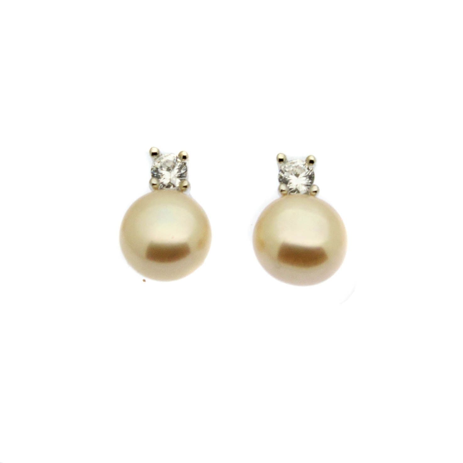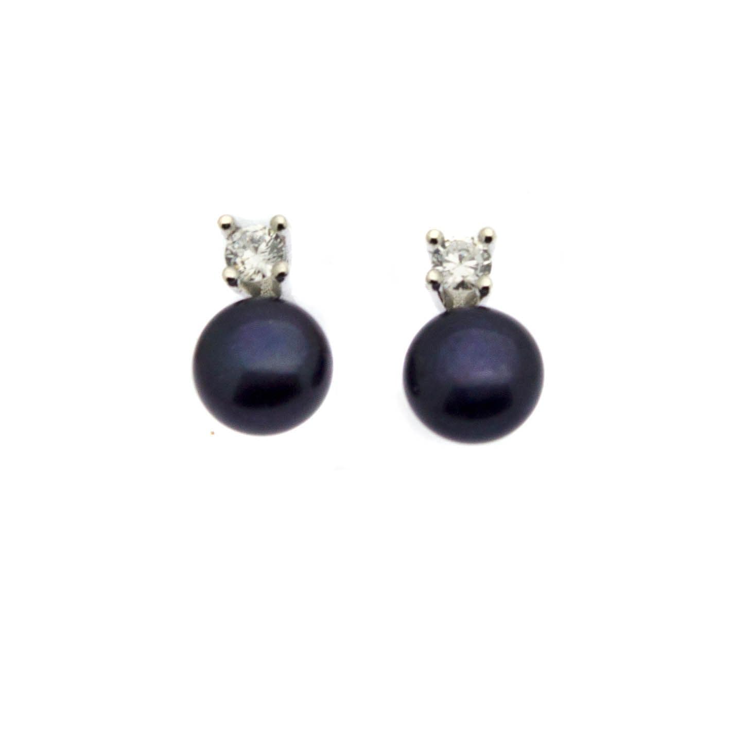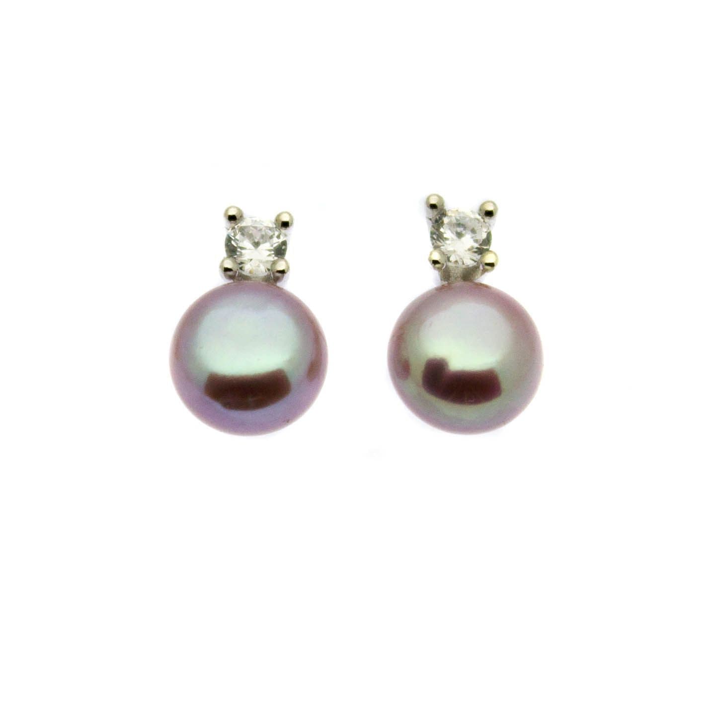 These high quality cultured freshwater button pearls are mounted on a sterling silver posts with a cubic zirconia (simulated diamond) stud. Available with White, Pink, Lavender or Black Pearls